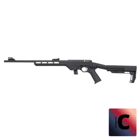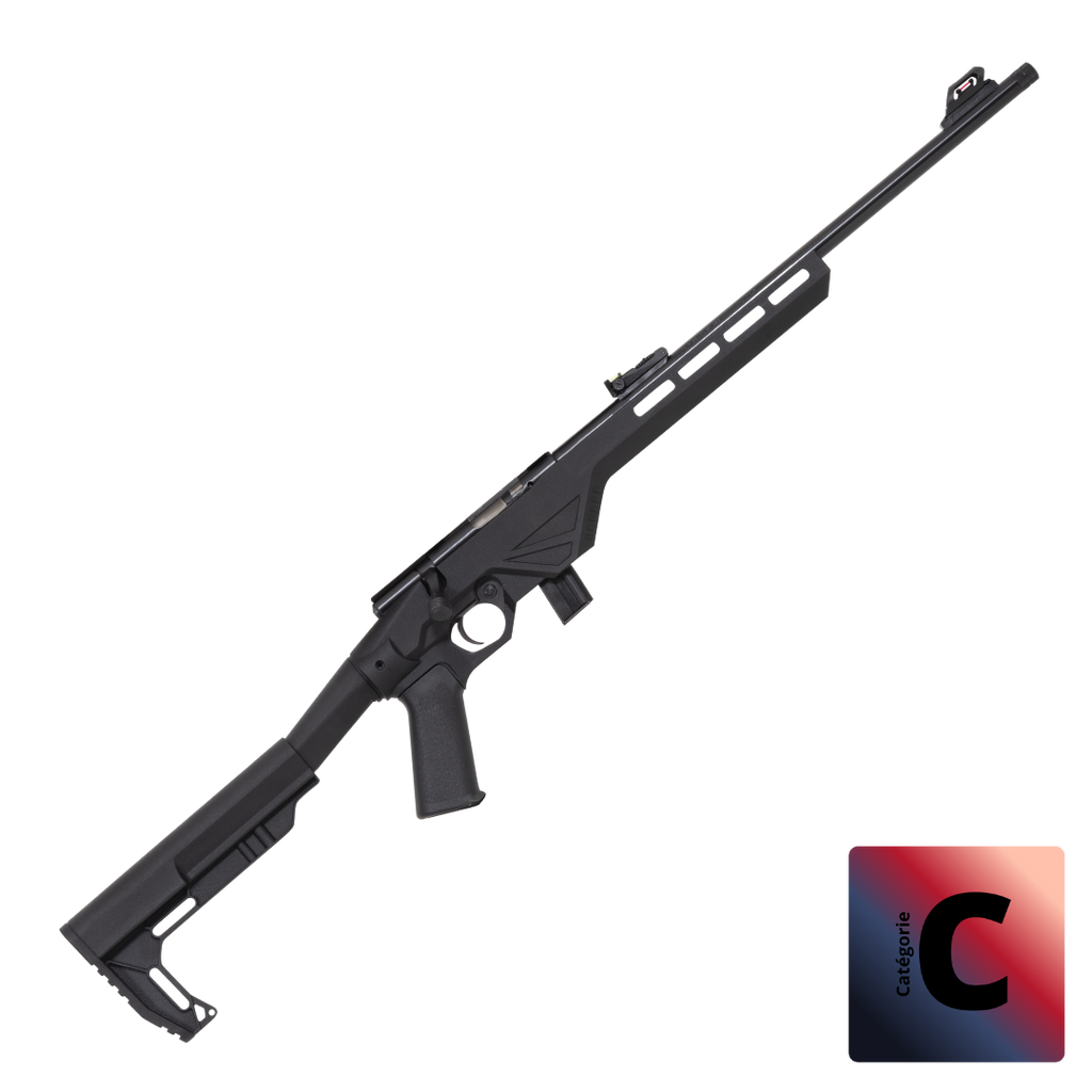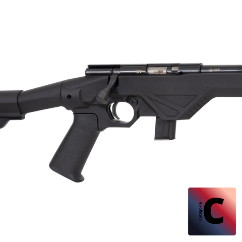 Carabine à verrou au design moderne équipée d'un garde main ajouré, une poignée pistolet pour une meilleure prise en main et une crosse tactique.