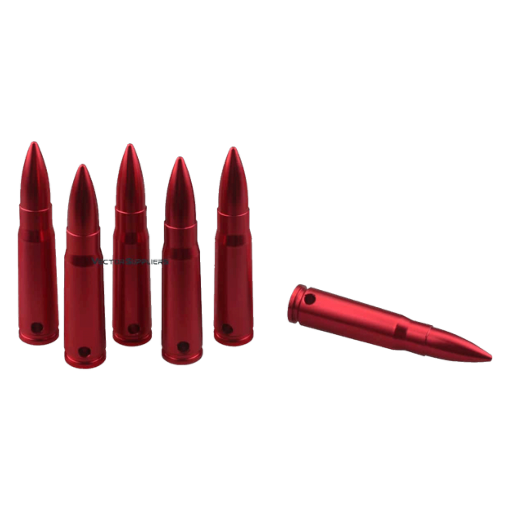 Ces cartouches factices 7.62x39 mm sont conçues pour imiter parfaitement une munition réelle, sans contenir de poudre, d amorce ni de projectile. Fabriquées en alliage d aluminium avec une finition anodisée rouge, elles sont idéales pour l entrainement, les tests de fonctionnement, la manipulation ou le stockage en toute sécurité. Chaque cartouche est équipée d un culot en silicone souple pour protéger le percuteur lors des tirs a sec. Lot de 6 pièces avec attache pratique.