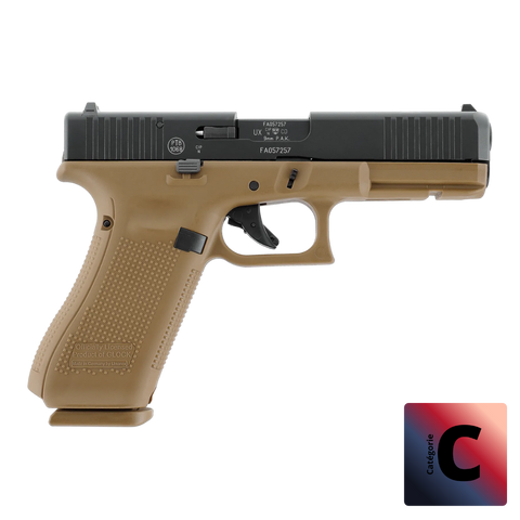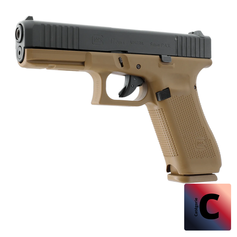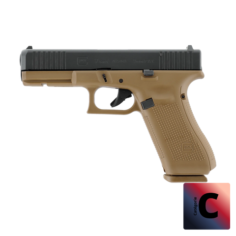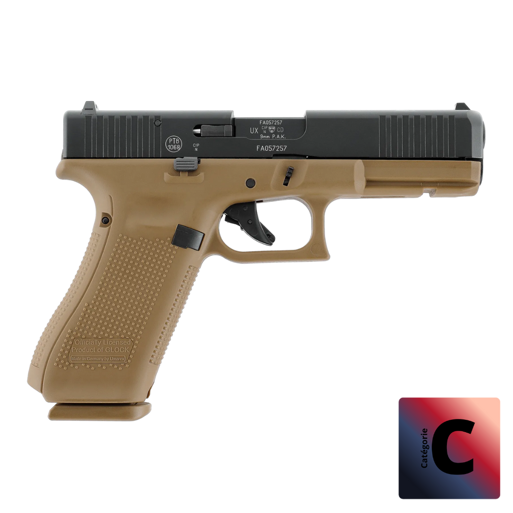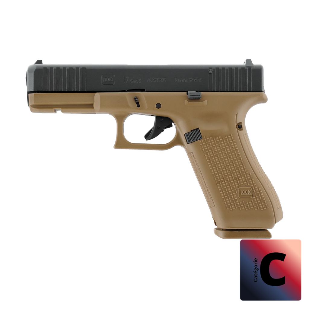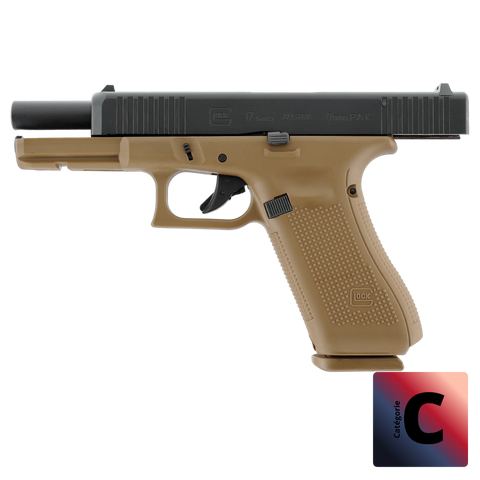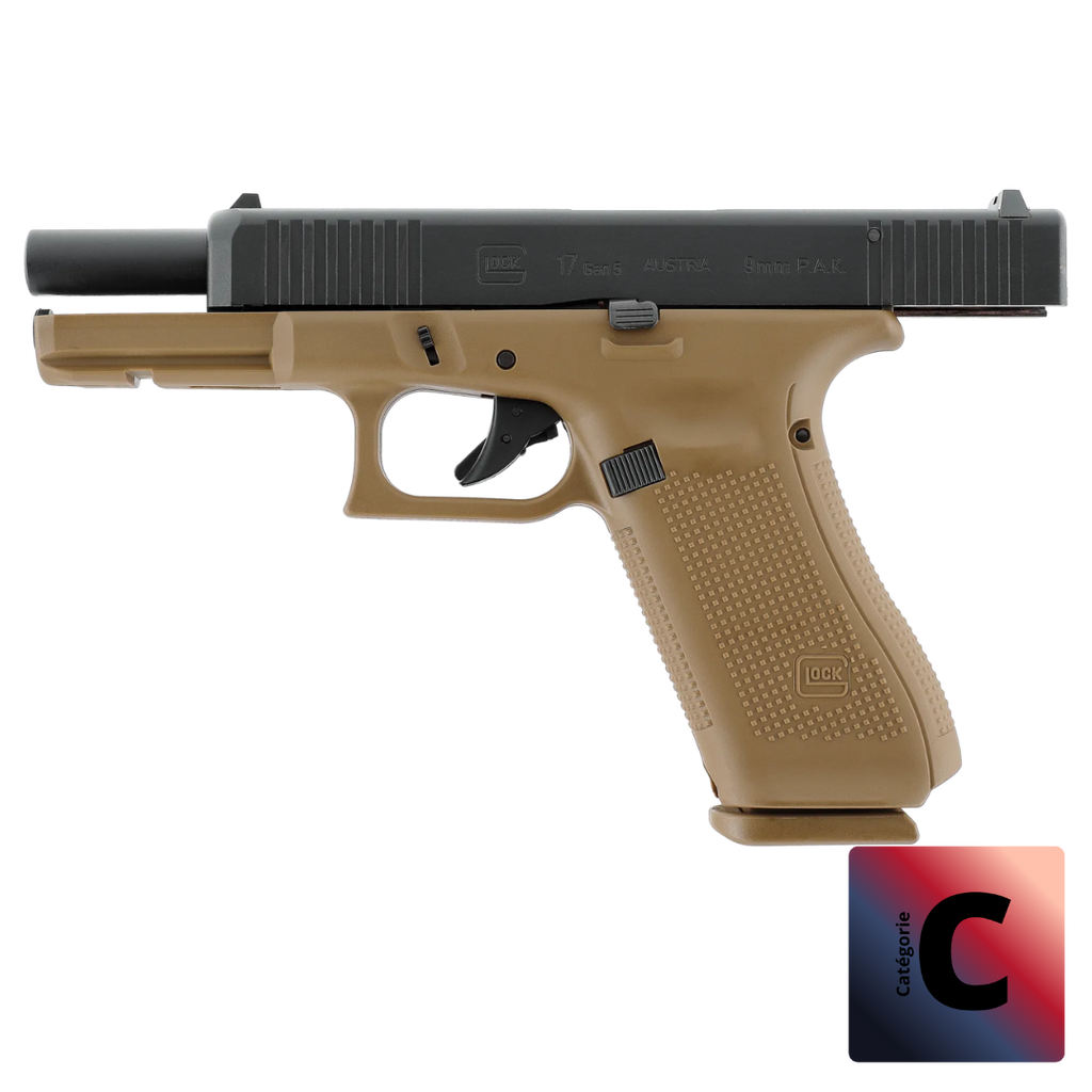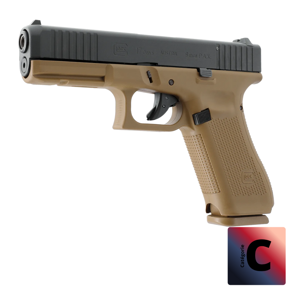 Le Glock 17 Gen5 9 mm P.A.K. reprend fidèlement les dimensions et le design du modèle original, ce qui permet l'utilisation dans la plupart des holsters standards ainsi que le montage d'accessoires Glock sur la poignée arrière.