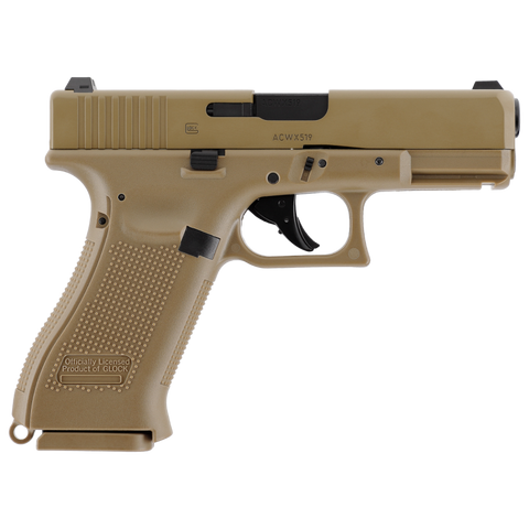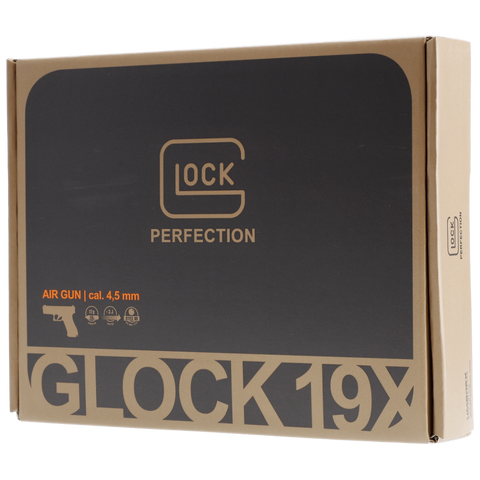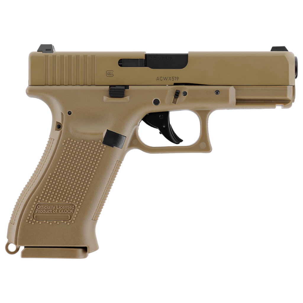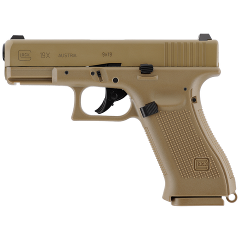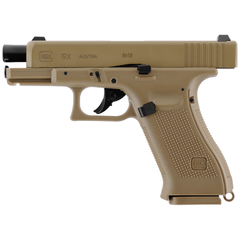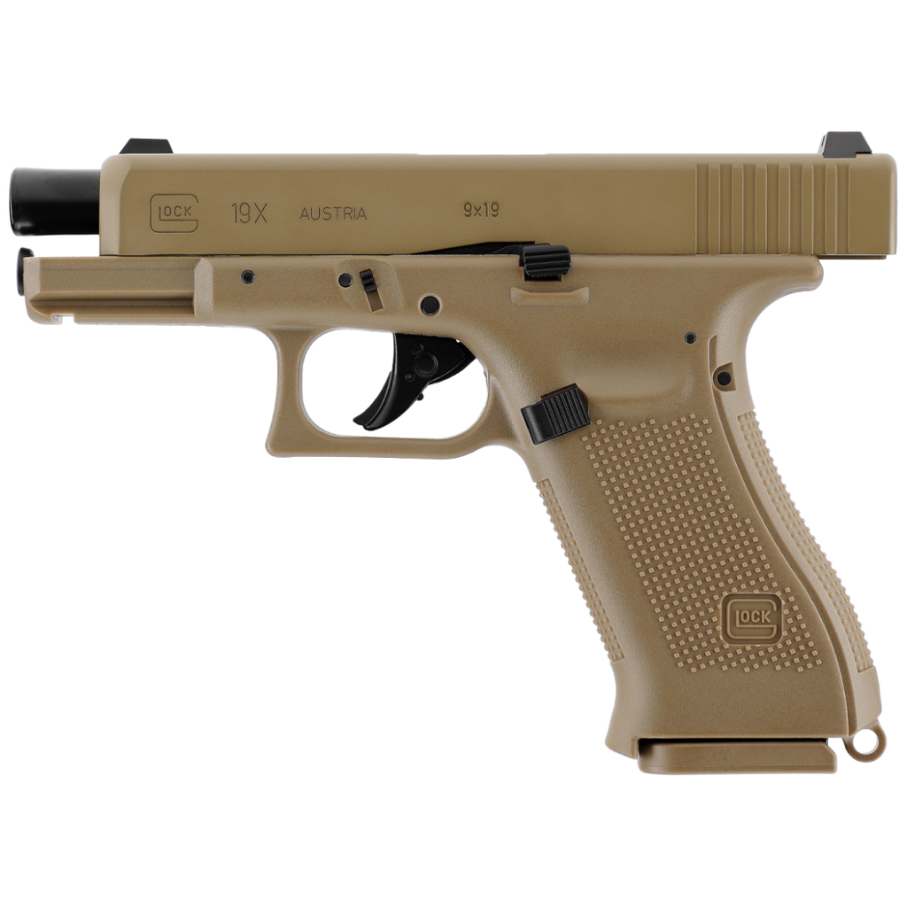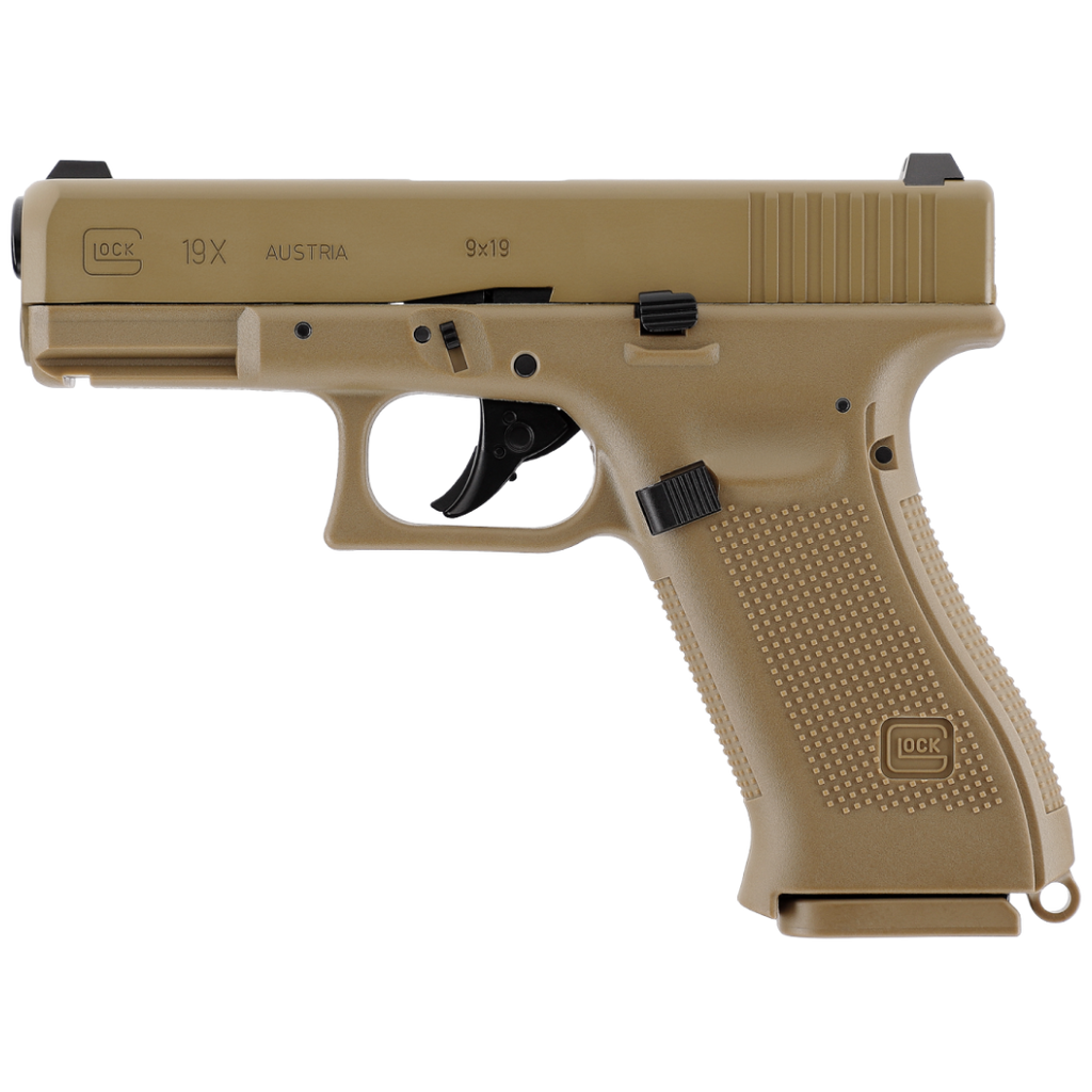 Le Glock 19X CO2 en calibre 4,5 mm BBs est une réplique reprenant les dimensions et marquages officiels. Premier pistolet « crossover » de Glock, il associe la carcasse pleine taille du Glock 17 à la culasse compacte du Glock 19, permettant un équilibre idéal entre prise en main et maniabilité. Sa finition couleur Coyote lui confère un style unique, immédiatement reconnaissable.