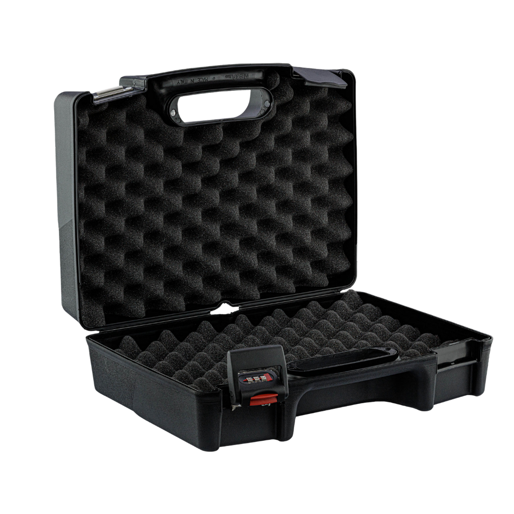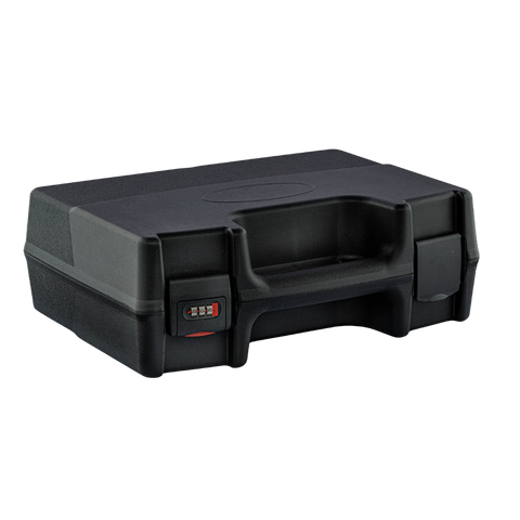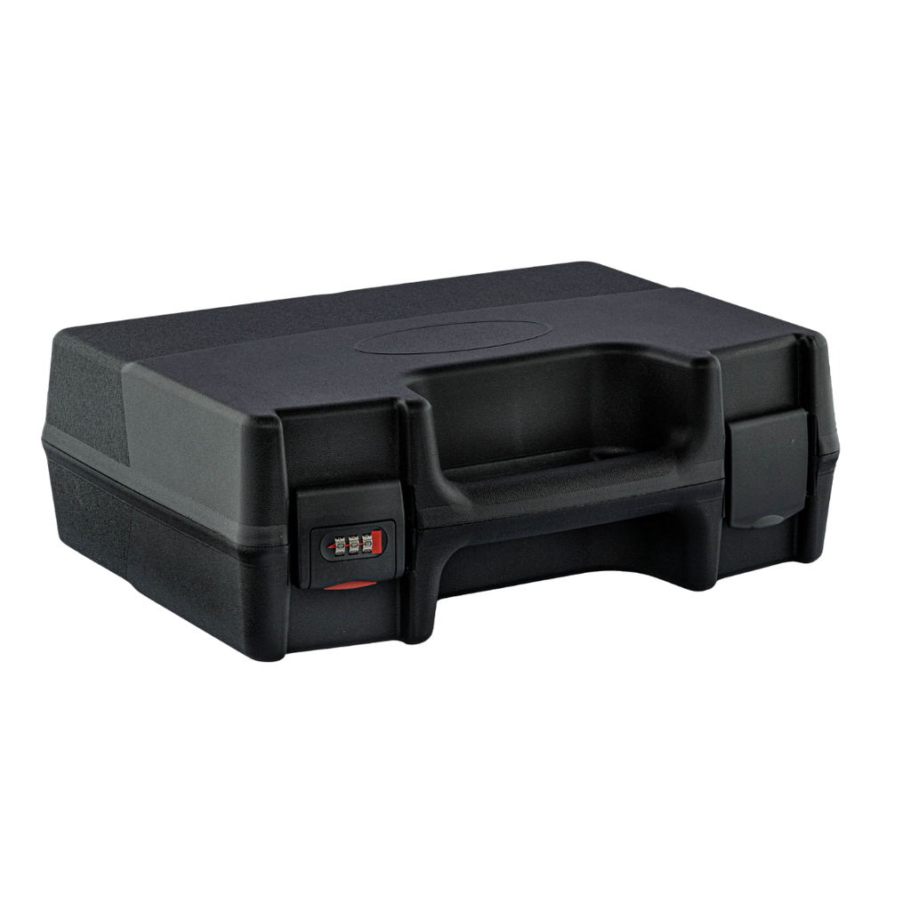 Mallette en polypropylène noir avec fermeture à code sur la serrure de gauche (combinaison à trois chiffres).