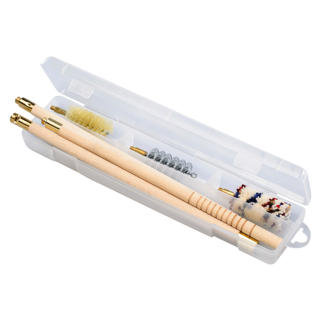 Boîte de nettoyage avec baguette bois démontable en trois parties. Livrée avec une brosse laine, une brosse en crin et une spirale acier. Livré en boîte plastique translucide.