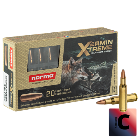 La Norma VerminXtreme en .222 Remington est pensée pour les tirs à moyenne distance sur renards, corvidés ou petits prédateurs. Son ogive Hollow Point produit une expansion foudroyante à l’impact, avec un transfert d’énergie immédiat dans la cible, réduisant les risques de fuite.